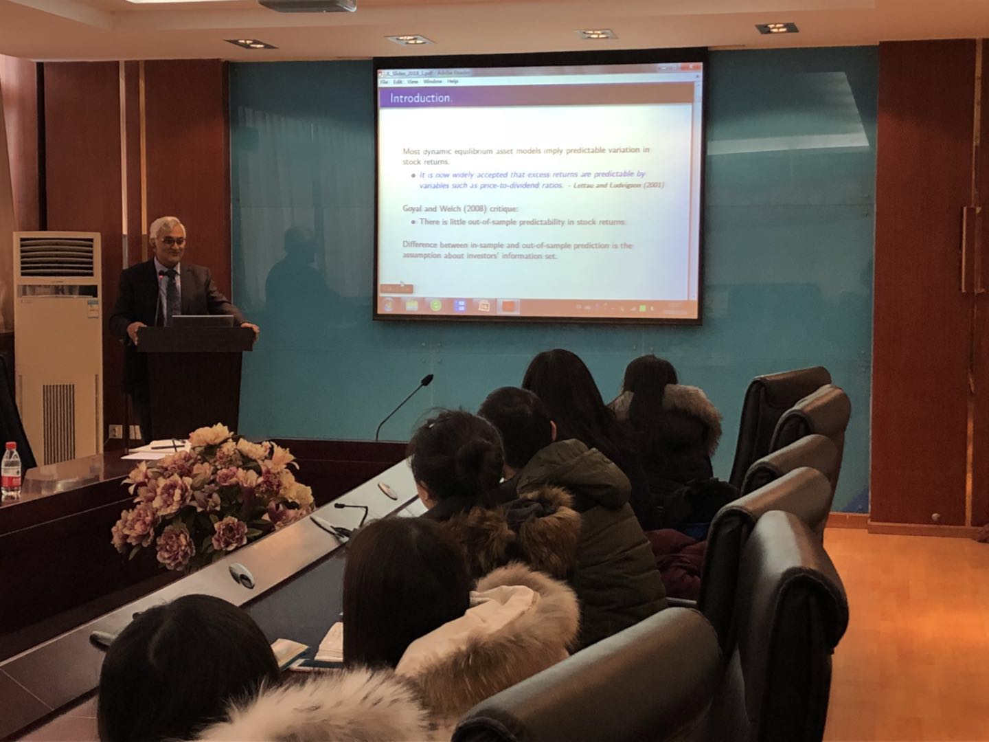 双方进行了简短交流后,Jagannathan教授做了题目为“Dividend Dynamics, Learning, and Expected Stock Index Returns”的学术报告,就股票市场的股利动态性、学习机制与预期股票指数回报等相关问题进行了深入分析和详细讲解。与会师生踊跃发言,深入与Jagannathan教授就报告中的数量模型设计、市场情境、实证分析等问题进行交流探讨。与会师生一致认为报告内容丰富、研究前沿、获益良多,有助于鼓励和启发师生们开展金融领域的高质量研究工作。