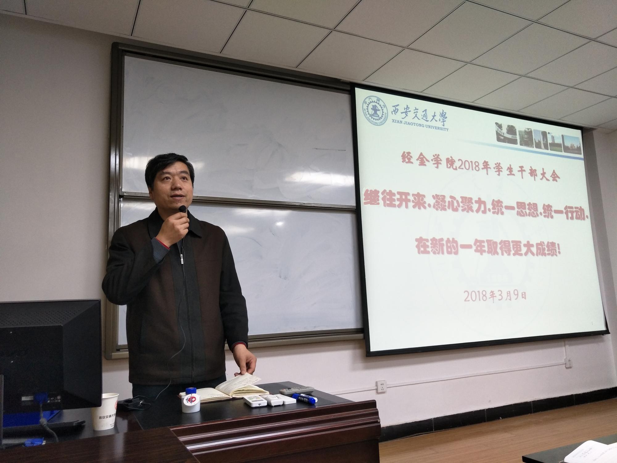 2018年学生干部大会在财主八楼报告厅举行。周建伦副书记、王平老师出席会议并讲话。兼职辅导员,团工委、研究生会、博文经济学社、国旗班主要学生干部,各党、团支部干部参加会议。会议由院团工委副书记史旭东主持。