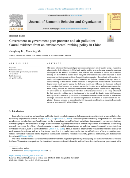 上述研究成果近期以Government-to-Government Peer Pressure and Air Pollution: Causal Evidence from an Environmental Ranking Policy in China为题被行为和组织经济学国际顶级期刊Journal of Economic Behavior & Organization(JEBO)正式接收,李江龙教授为该文第一作者,熟女av