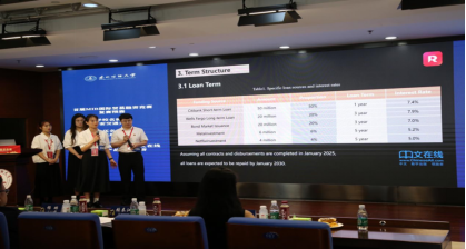 决赛阶段重点考察各队伍的案例分析能力、融资方案撰写能力和临场答辩能力。进入决赛的8支队伍随机抽取案例题目,限制在20个小时内完成案例分析、全英文融资方案撰写和汇报PPT撰写,并进行8分钟全英文现场汇报、6分钟金融机构场景交流和6分钟国外客户场景交流,最终由金融界和学术界专家共同评审,竞选出各个队伍的排名和奖项。