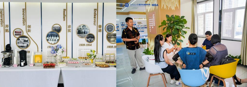 公开课后的茶歇环节,为学生与老师们搭建了沟通咨询的桥梁。咖啡、茶点与旁立的学院文化墙相映成趣,为交流营造出轻松氛围。文化墙上挂着学院历史沿革照片与优秀成果展示,既传递着学院的文化底蕴,也让考生在茶歇间隙能直观感受校园氛围。从报考条件的细节到课程内容的深度,从“涵英计划”面试的评分侧重到学习时间的弹性安排……问题覆盖全面,解答细致具体。