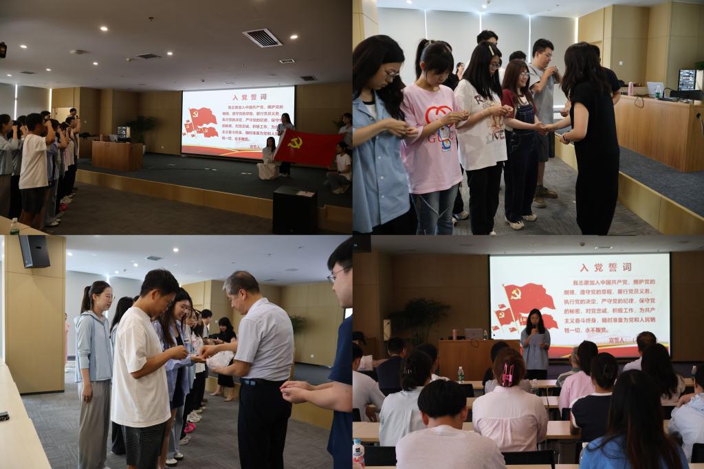 兼职辅导员、2023级博士生党支部书记石晨晖担任领誓人,带领全体新发展党员庄严宣誓,老党员们也一同重温入党誓词。面对鲜红的党旗,党员们高举右拳,誓言铿锵,表达了对党的忠诚和为共产主义事业奋斗终身的坚定决心。