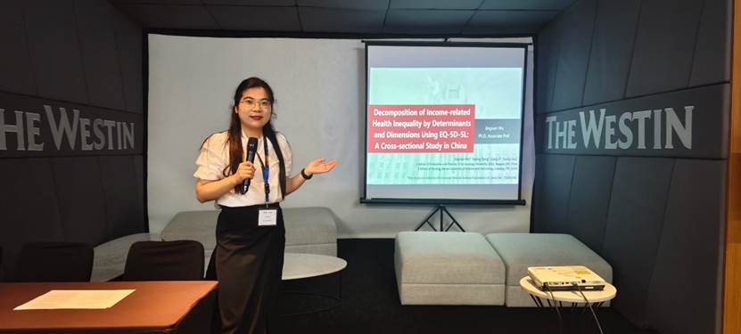 吴静娴副教授在大会上作了两场主题口头报告,分别为:“Decomposition of Income-related Health Inequality by Determinants and Dimensions Using EQ-5D-5L: A Cross-sectional Study in China”与“Socioeconomic-related Inequalities in Multi-dimensional Health Among Older Adults in China: A Population-based Cross-sectional Study”,深入剖析了中国居民收入相关健康不平等的多维度特征与决定因素。