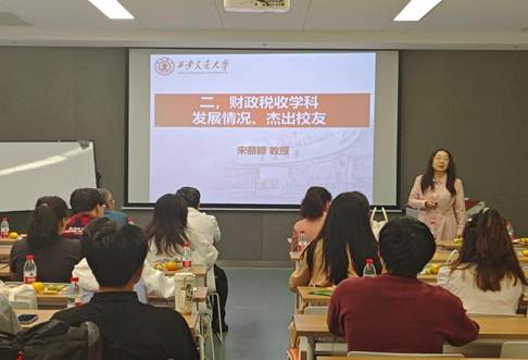 财政学科带头人宋丽颖教授向师生们介绍了目前财政税收学科发展情况、我国财政与税收发展的历史、当代中国财政税收制度发展现状,对财政学硕研究生的培养要求进行了详细介绍,同时也介绍了财政系的杰出校友,鼓励同学们认真学习前沿知识、努力开展科学研究、积极投身社会实践,在交大这个大平台上取得更好的成果。