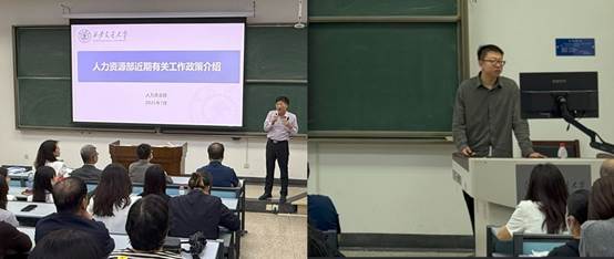 和云祥向老师们详细介绍了学校近期出台的人事制度和改革方案,并结合实际工作对制度要点与执行细节作了解读。刘子豪对人才引进政策及职称评聘标准作了专项阐释,重点回应了广大教师普遍关注的职称评审条件与流程等问题。