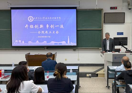 全院教职工大会在兴庆校区召开。校党委副书记、院长孙早,校学生处处长、学工部部长、大学生党委书记张丹,校人力资源部社保中心主任和云祥,校人力资源部岗位与聘用办公室主管刘子豪出席会议,学院领导班子成员及全体教职工参加会议。大会由院党委书记周建伦主持。