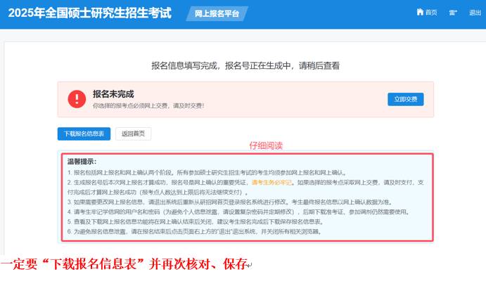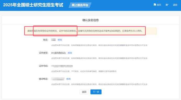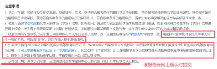 考生应认真核对并确认本人网上报名信息。报名信息经考生确认后一律不作修改。考生因不符合报考条件或者相关政策要求、网报信息填写错误、弄虚作假等情形,造成后续不能进行网上确认、不能考试(含初试和复试)或录取的,后果均由考生本人承担。