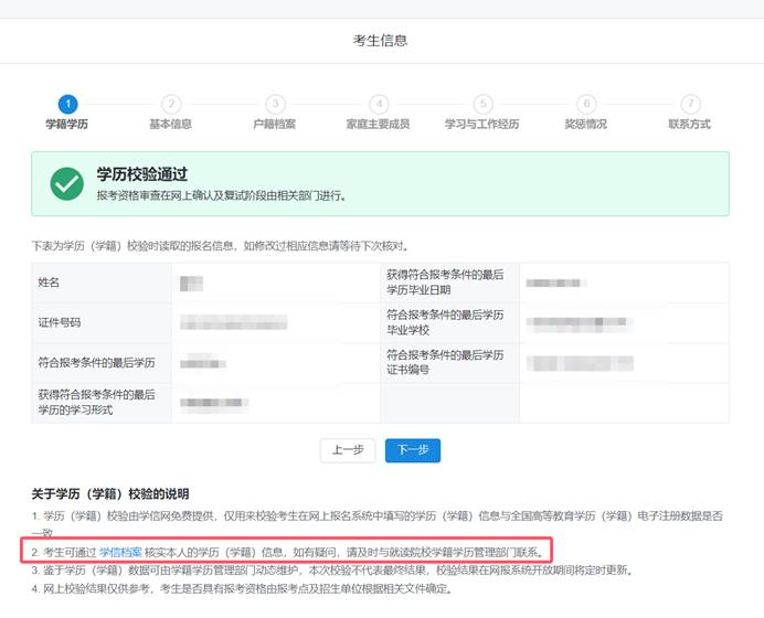 4.考生可在网上报名期间查看学历(学籍)校验结果。为确保核验顺利,建议考生提前登录“中国高等教育学生信息网”(网址://www.chsi.com.cn)查询本人学历(学籍)信息。未能通过学历(学籍)网上校验的考生,应在招生单位规定时间内按要求完成学历(学籍)核验。