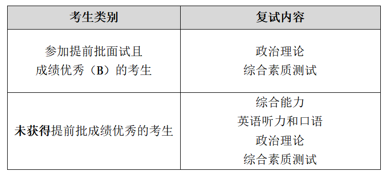 复试内容含综合能力、英语听力和口语、政治理论、综合素质测试、思想政治素质及品德考核。