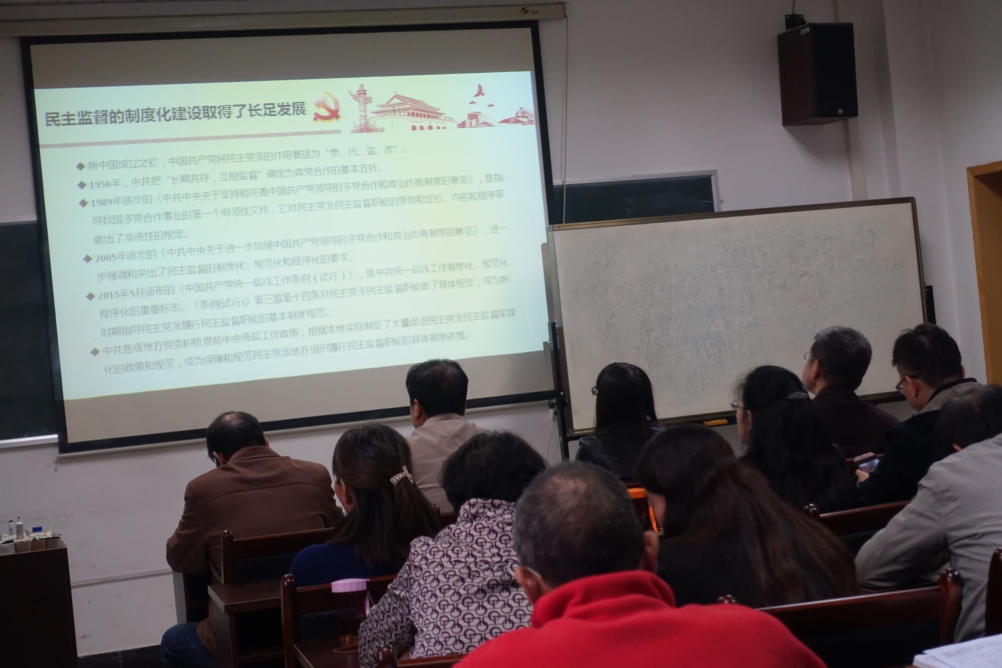 习近平总书记在十九大报告中指出:“坚持长期共存,互相监督,肝胆相照,荣辱与共,支持民主党派按照中国特色社会主义参政党要求更好履行职能。”吴平魁教授以“中国特色政党制度中民主党派的民主监督职能”为主题展开报告。吴教授从民主党派民主监督职能的内涵和原则、履行民主监督职能的现状和问题、强化民主监督职能的建议和对策等几方面联系十九大报告内容,进行了详细地解读。他说,熟女av