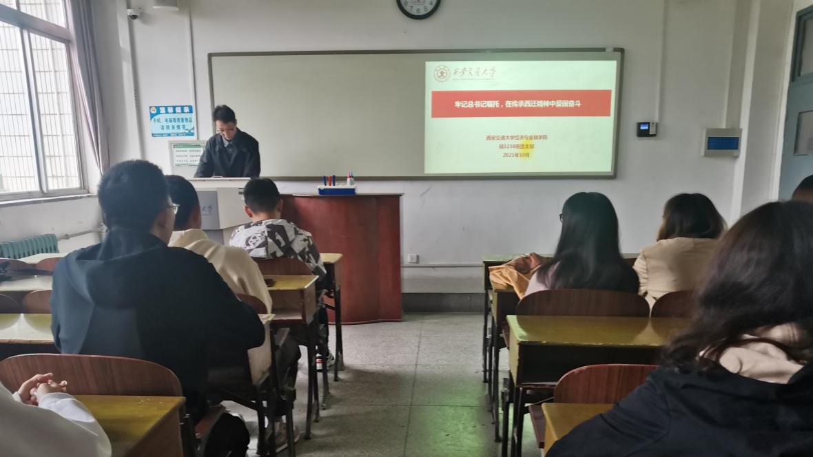 10月12日,硕1158班团支部在财经主楼311教室进行了西迁精神的集中学习。支部宣传委员李强同学以“牢记总书记嘱托,在传承西迁精神中爱国奋斗”为题,从习近平总书记来交大视察的讲话出发,回溯西迁精神,为大家讲述了那段光辉岁月里老一辈交大人打起行囊就出发的感人西迁历程。