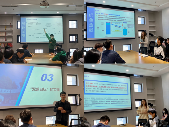 胡健、艾乐、付昭和王宇茜分别从绿色金融、碳交易市场、绿色金融工具和陕西绿色金融现状四个方面介绍与碳达峰、碳中和相关的金融知识,提出“产业为本,金融助推”理念,以“绿色”作为产业之本,做好资金的融通,保障现金流的稳定,使金融更好地为实体产业服务,促进经济增长,以达到“双碳”目标的实现。