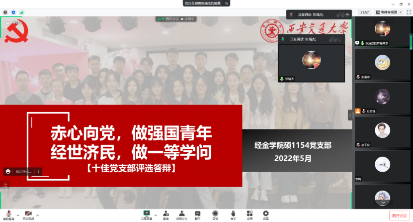研究生会主席、硕1154党支部书记张瑞杰做主题分享,通过回顾他的学生工作经历,介绍在迎新活动、班级管理等方面的工作,从个人层面展现榜样青年的风采。接着他以“一个主题、两个路线、三个目标、四个阵地、五个小组”为主线,分享所在集体的党团班高效协作的经验教训,从基层党团建设角度展现先进集体的事迹。最后张瑞杰以视频的方式分享疫情封控期间的点滴,从招募志愿者、组建志愿先锋队、到物资的协调与搬运,充分展示出一位优秀党员忠于职守、共渡难关的心路历程。他表示,站在新时代、新起点,希望各位学子要时刻铭记来时的路,不忘初心、坚定信念,成为有担当、有理想、有情怀的新时代青年。