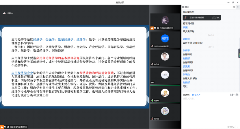 姚智昕同学从应用经济学的含义出发,介绍其主要研究内容,并从国际贸易学、金融学、财政学、统计学等不同方向,有针对性地对不同专业的未来职业选择进行详细讲解,引发学生对专业课程学习的深度思考。