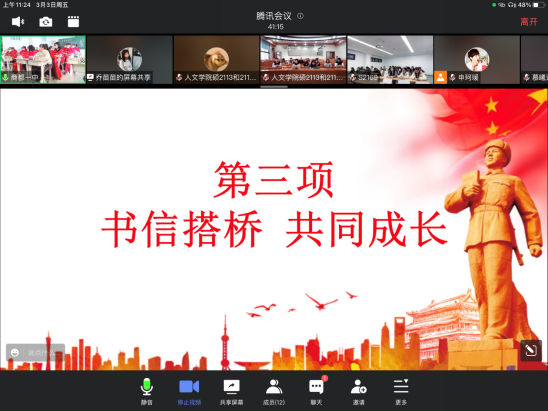 硕2169党支部、人文学院硕2113和2114党支部、第24届研究生支教团内蒙分队与商都县第一中学2204班开展以“坚守崇高理想,传承雷锋精神”为主题的“学雷锋”活动,线上交流、共同学习雷锋精神,在与会成员心中播撒“全心全意为人民服务”的种子。