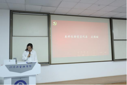 本科生第一党支部武豫璇同志代表本科生新党员发言。她对学院党委的教育和培养表示衷心感谢,表示在鲜红的党旗下庄严宣誓深感光荣自豪、使命重大,入党宣誓是一名党员政治生命开始的象征,是一个共产党人万里长征的第一步。她代表本科生新发展党员向组织郑重承诺,在今后的学习生活中,继续坚持提升自我政治思想修养,坚定理想信念,树立强烈的主人翁意识,不断争先创优,充分发挥共产党员的先锋模范作用。
