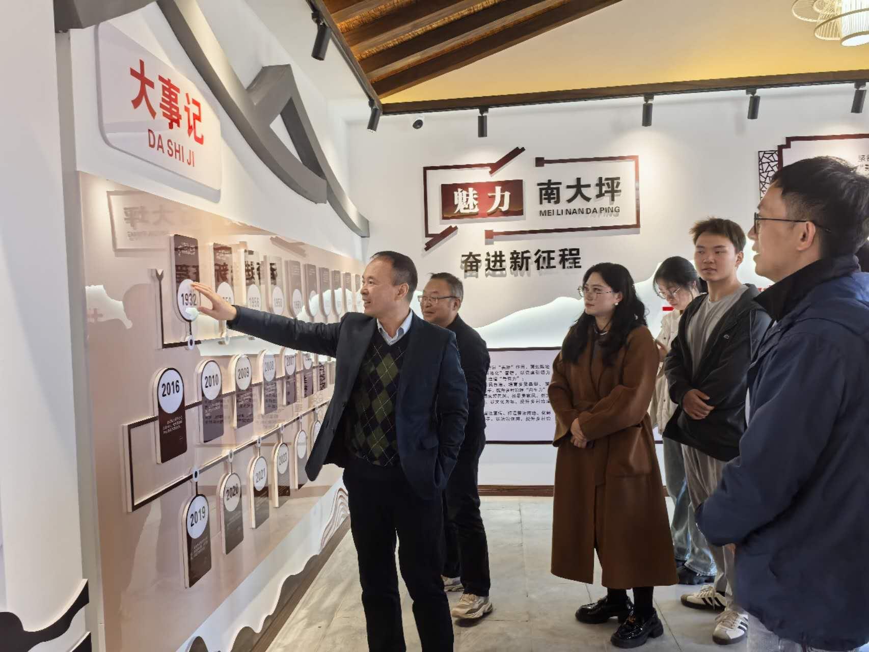 随后,师生一行前往村史馆,参观并了解村庄历史。广济镇党委书记夏党辉热情地为大家介绍了在乡村发展和文化传承中发挥关键作用的“乡贤”,并回顾了南大坪村的发展历程。鄢哲明老师对此深有感触,他指出,“乡贤”在乡村治理和社会凝聚力建设中具有不可或缺的作用,为乡村治理提供了独特的资源。