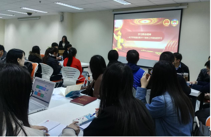 会议开始,宋燕平同志与苗进同志向其他成员介绍了“两会”的发展历程,对两会热点进行了归纳并通过PPT讲解的形式给其他党员成员进行了解读。他们从李克强总理2017政府工作报告中提炼出九点重要内容。包括:用改革的办法深入推进“三去一降一补”,深化重要领域和关键环节改革,进一步释放国内需求潜力,以创新引领实体经济转型升级,促进农业稳定发展和农民持续增收,积极主动扩大对外开放,加大生态环境保护治理力度,推进以保障和改善民生为重点的社会建设,全面加强政府自身建设。