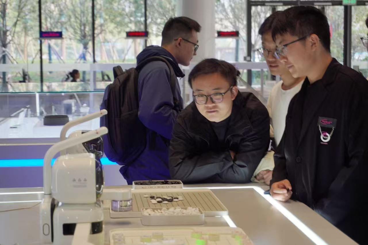 在理论讲解后,同学们来到秦创原的科技创新成果展示区,参观了多个企业的创新产品,包括中易建科技的智慧绿色能源沙盘、陕煤技术研究院的新能源材料以及隆基绿能的单晶硅材料等。此外,商汤智能科技的“元萝卜”AI下棋机器人也吸引了同学们的注意,大家纷纷体验,感受人工智能前沿科技。