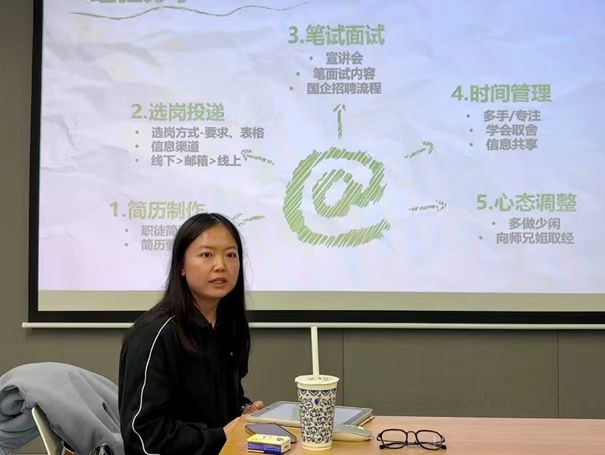 在经验分享环节,赵妍学姐重点围绕简历制作、网申、笔试、面试技巧等多个方面进行讲解。她强调,在简历中应突出学校背景、荣誉奖项、高绩点、高排名及实习经历等核心要素。此外,学姐还详细讲解了如何在面试中展示自己的专业能力、实践经验以及相应的沟通技巧。在面对求职压力时,她建议同学们要学会调整心态,接受不完美,同时热爱生活,在日常中多与他人沟通、不断提升自己。