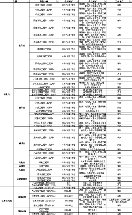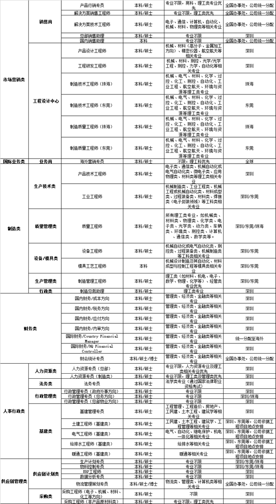 本次招聘职位覆盖研发类、技术市场类、市场营销类、国际业务类、制造类、财务类、人事行政类和供应链管理类8大类别,共招聘1500余人,欢迎同学们积极投递!