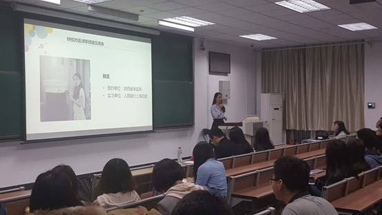 第一位进行分享的是通过国考顺利签约陕西省保监局的韩笑。她从准备国考的心态、时间安排、备考重点等方面向在场同学讲述了她是怎样一步步拿到招录比接近1:200的陕西省保监局offer的。她提到,复习国考时要重点突出,根据自身所长确定申论和行测两大模块的目标分数,在复习中有的放矢;复试过程中要用真诚打动面试官。