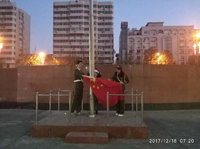 迎着朝阳,升旗小组的同学们队列整齐,走向升旗台,早早地为升旗仪式做好准备。七点二十分,“升国旗,奏国歌,全场行注目礼”,随着高亢的国歌声响起,护旗手迅速将鲜艳的国旗展于空中,在全场的注目礼下,五星红旗冉冉升起。每一次升旗仪式都带给我们新的震撼,爱国情怀油然而生。