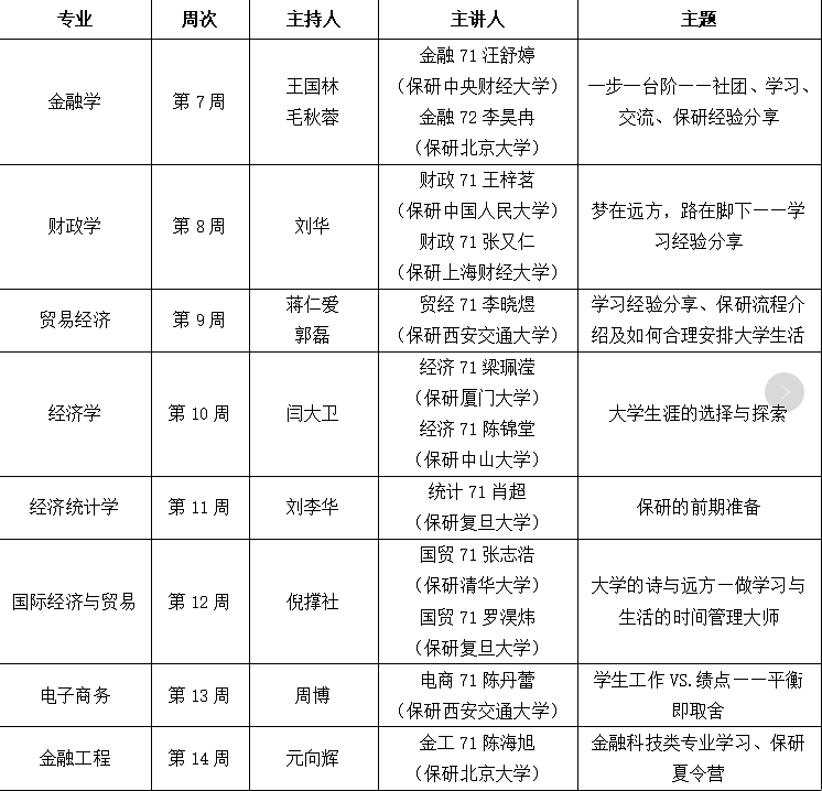 为帮助大一新生更好地适应大学生活、做好学业规划,学院从本学期第7周开始,推出“知新讲坛”之学习经验交流系列活动,邀请各专业2017级优秀学生代表向大一同学介绍学习、交流、竞赛、保研等经验,分享大学生活心得。系列活动安排如下,具体时间地点另行通知。