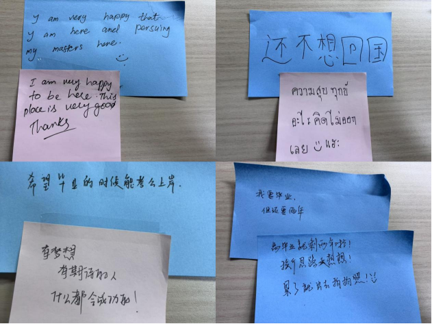 活动以“匿名倾诉-互助解答-鲜花回馈”的新颖模式,精心设计三大特色环节,为参与者搭建温暖的心灵沟通桥梁。活动现场,参与者纷纷拿起笔,将内心深处的烦恼化作文字留在纸上。既有被论文截止日期追得焦头烂额的焦虑,组会前紧张不安的忐忑;也有做实验疲惫不堪、代码出现bug时的崩溃瞬间;更有找不到心仪实习工作的迷茫困惑,对未来方向的不知所措,以及毕业离校时的依依不舍。特别引人注目的是留学生们用中英文深情告白:“还不想回国”“We love China and Chinese people”“We love XJTU”,字里行间满是对中国、对交大的深厚热爱。
