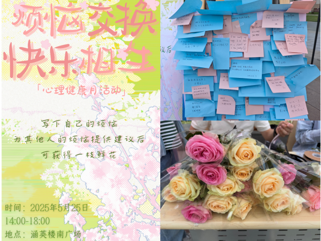 “烦恼交换・快乐相生” 活动深度践行 “5.25心理健康日” 关爱自我、悦纳自我的核心理念,以轻松有趣、高度互动的形式,为师生打造了一个可以敞开心扉的情绪树洞。当烦恼被勇敢倾诉,当陌生的建议化作心灵慰藉,一场跨越隔阂的心灵共鸣就此产生。此次活动作为心理健康月系列活动的亮点活动,不仅为参与者提供了情绪疏解的有效渠道,更在校园内传递着人与人之间的善意与温暖,营造出积极向上的心理健康氛围。