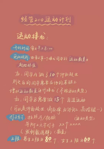 因雁塔校区封控管理,学生封闭在宿舍,学院从1月6日起组织班主任与学业导师开展联合班会,从生活和学习上了解学生遇到的困难,各班收集汇总问题后学院及时反馈相关部门协调处理。为调动大家在宿舍学习的积极性,有的班级开展云自习打卡,互相监督保证学习时间;考虑无法参加户外运动,有的班级发起了健身打卡活动,室内锻炼增强体质。