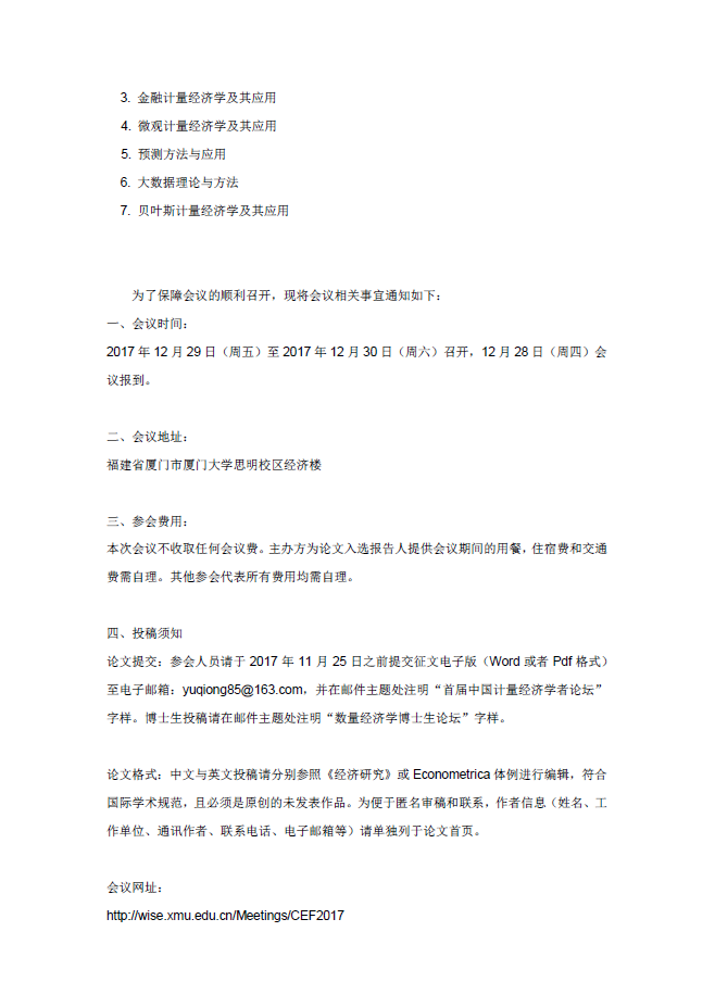 首届中国计量经济学者论坛(2017)暨全国数量经济学博士生论坛征文启事