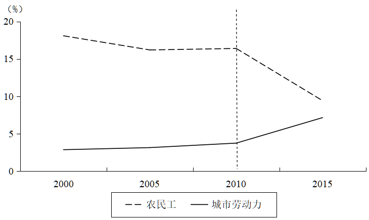 2000—2015年农民工和城市劳动力“跨地区”流动性变化趋势